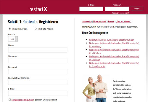 restartX die kostenfreie Jobbörse für Rentner und Unternehmen ist erfolgreich im Web gestartet. Im hohen Alter muss man nicht gleich untätig werden und einen geruhsamen Lebensabend verbringen, wie es so schön heißt. (Basierend auf Total Visits weltweit, Quelle: comScore). Andere Rentner sind auf diesen Zusatzverdienst angewiesen.